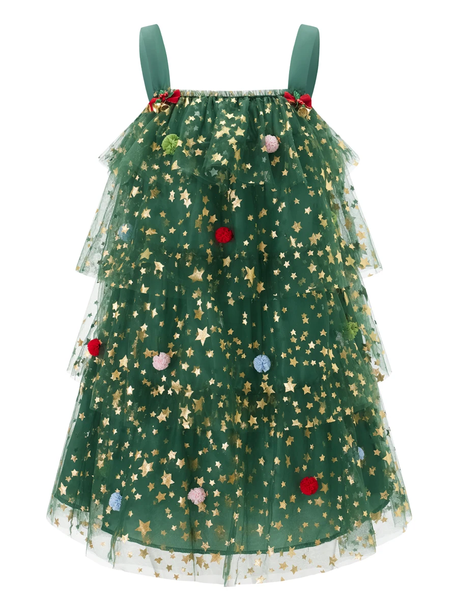 Women’s Christmas Tree Dress Glitter Star Sleeveless Loose Layered Tulle Dress Holiday Mini Dress
