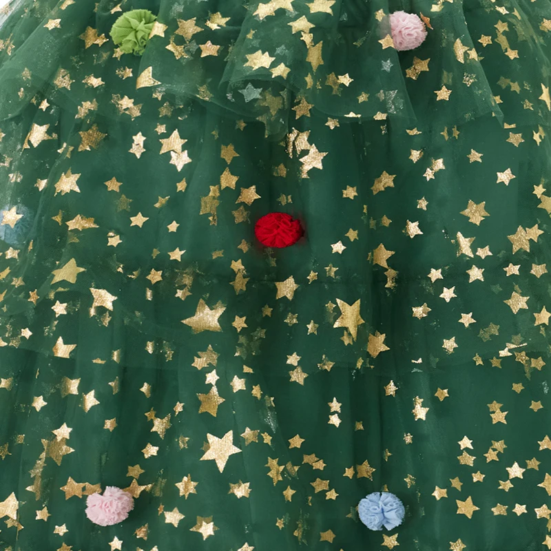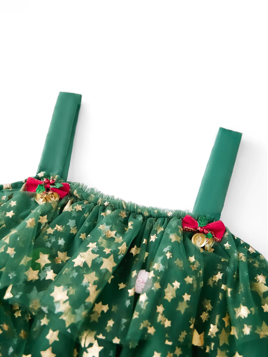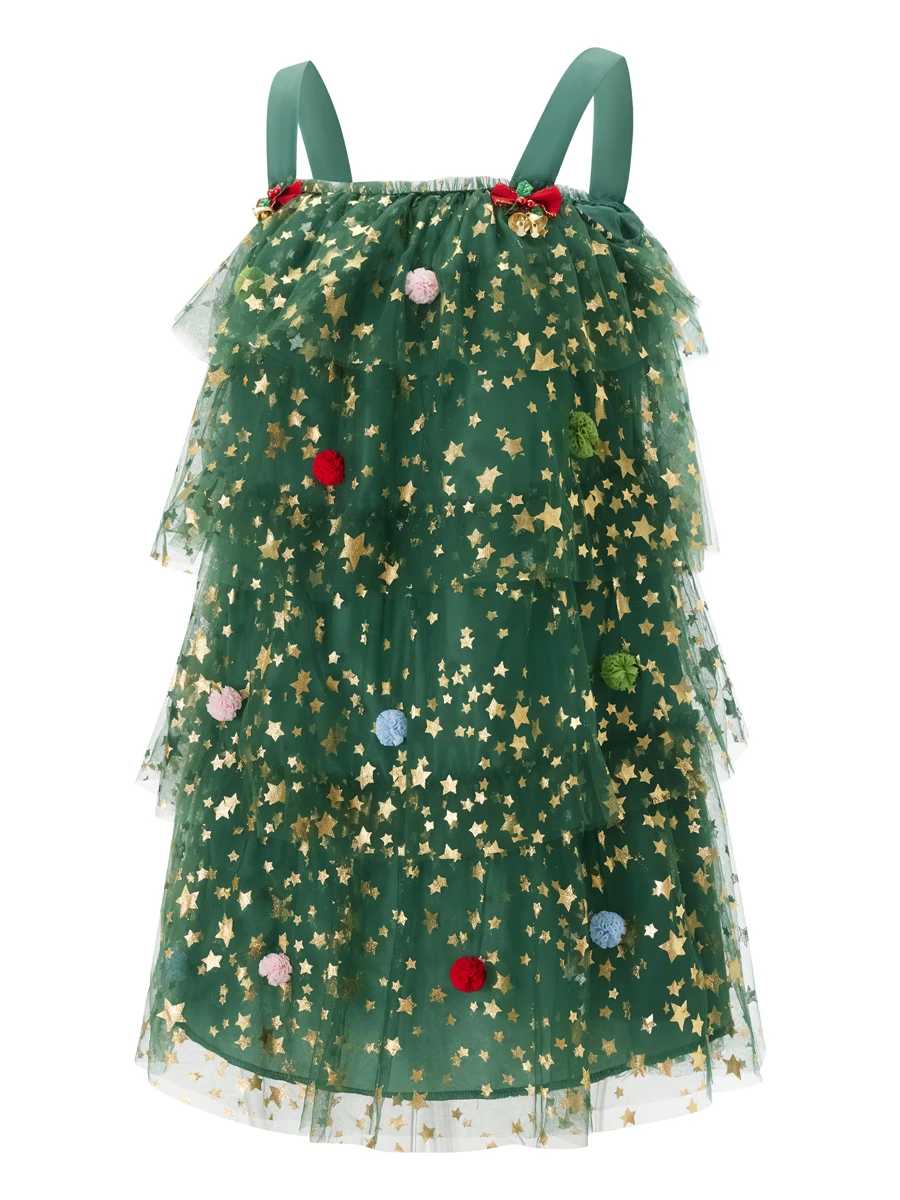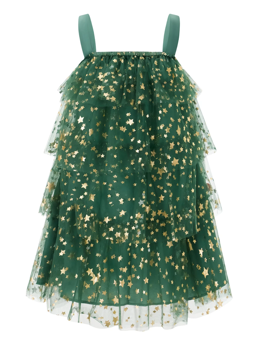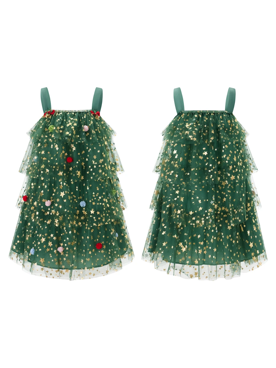 Women’s Christmas Tree Dress Glitter Star Sleeveless Loose Layered Tulle Dress Holiday Mini Dress